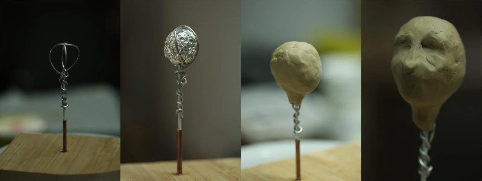 I used the Medium grade plastecine, and some pretty basic wooden sculpting tools. Drilled a hole into some scrap wood, just wide enough for this copper tubing. Epoxied it in place. Then used some coat hanger wire (for its stiffness) and armature wire (for its armatureness) to form a rough head. Filled it with crumpled up aluminum foil, and roughly coated it with some plastecine.